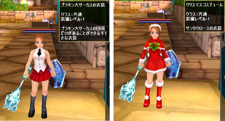 そうしますとフラッシュの広告で「全員配布アイテム」の文字が・・・ 早速クリックして詳細を見てみますと全員配布のアイテムは2つで12/7と1 2/14までにゲームをプレイした人を対象に「ブラキン大サーカス」と「クリ スマスコスチューム」を無料でプレゼントするというものです。 「ブラキン大サーカス」のコスチュームはお笑いの安田大サーカスの衣装(裸 ネクタイ&フンドシ)ですが・・・ 「クリスマスコスチューム」は普通に課金アイテムと出してもおかしくない物 でした。 それにしても流石H!GH5(運営)だと思いました ムを合成などで手に入れるのですが、上記の2種類のアイテムは普通にインベ ントリに入ってましたから あとこれだけではなく「クリスマス限定ちょこモン」というペットがMOBを 狩ったりする事でDROPします。 いまプレイしているラ○ルズが街中では重過ぎるので余計に感じました