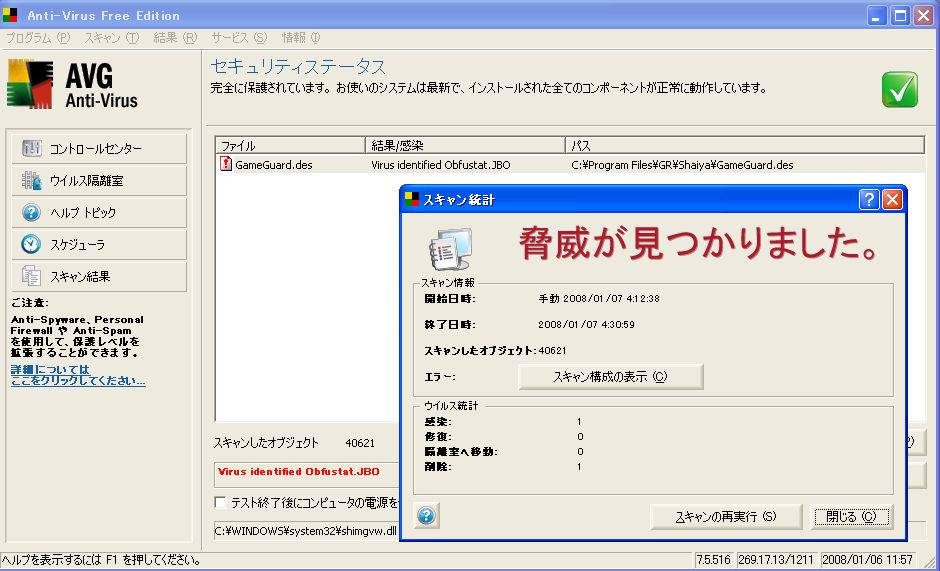 私は、フリーソフト(無料)のアンチウイルスソフト AVG を入れています。