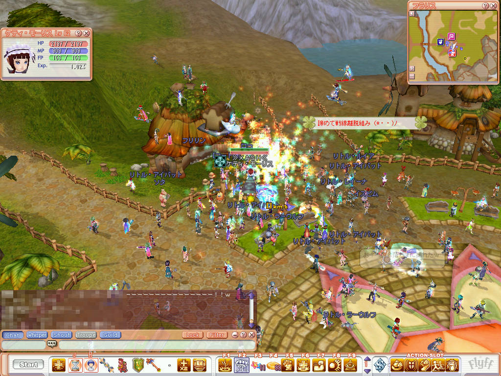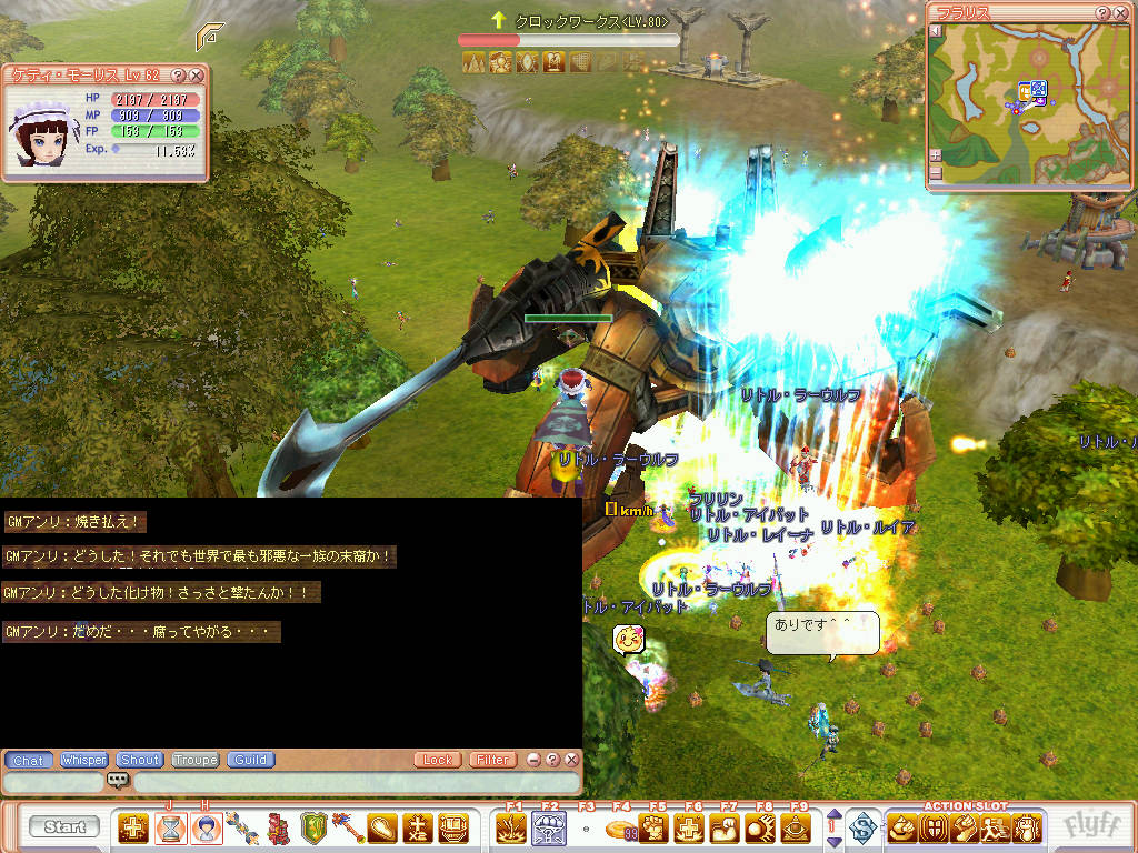 内容は、 イローナはロシャと相談して、イローナを見つけた人に 浴衣をプレゼントする事に決めました。 というイベントでした。 イローナという運営さんのキャラを広場でいち早く見つけ浴衣を購入するというものでした・・・・ しかしイローナの露店を見つけても他PC(他プレイヤー)に先を越されて買えたものでは無かったです^^; どうせなら昔みたいにモンスターを倒して愛のハートを出してそのアイテムと交換にして欲しかったです;; ↑の詳しい事は、公式のBBSを見ればわかります・・・・ しかし、フリフは過疎ってると思っていたのですが・・・・・・・意外と人が多かったので何故か安心しましたw 本当にすごい人だかりでした^^; 下写真は、イベント終了後のオマケです。町の外に「クロックワークス(LV80)」の召還されてました。 初めてクロックワークスみたのですが、すごく大きかったです。 あとGMアンリさんの台詞が・・・・・・ 風の○のナウ○カの某キャラのセリフです。 誰もオープンチャットでツッコミしないのが笑えました^^; |