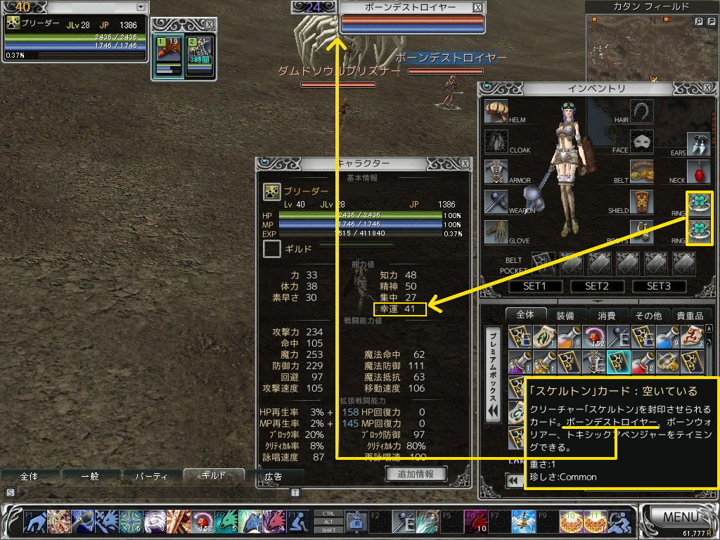 ティマーがLV40に成りましたので、大事に取っておいた「スケルトンカード」で再挑戦してみました 今回は、コモン3回目の挑戦です。すべて「スケルトン」のティミングです^^; 気休めかもしれませんが、「幸運のクローバー:幸運+4」を2個装備して ティミングできるMOBのうち 一番LVの低いLV24ボーンデストロイヤーを