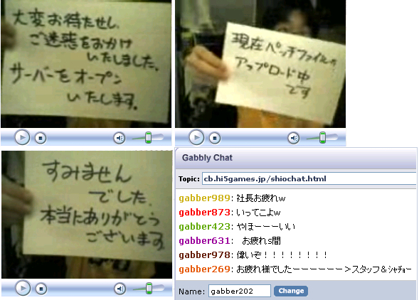 ちょっと前の出来事になりますが、8/18に緊急サーバーメンテがありました。 メンテ自体は、伸びに伸びて8月18日22時~8月19日2時まで4時間延長しました。(その前日に大幅UPDATEの為に8月17日10:00~21:00メンテ) 長かったです・・・メンテ時間 しかし、ブラキンの運営の他と違う所は、社長室にライブカメラがあり生中継をしています。 下の写真は、緊急メンテ当日のメンテ終了直前のライブカメラのSSです